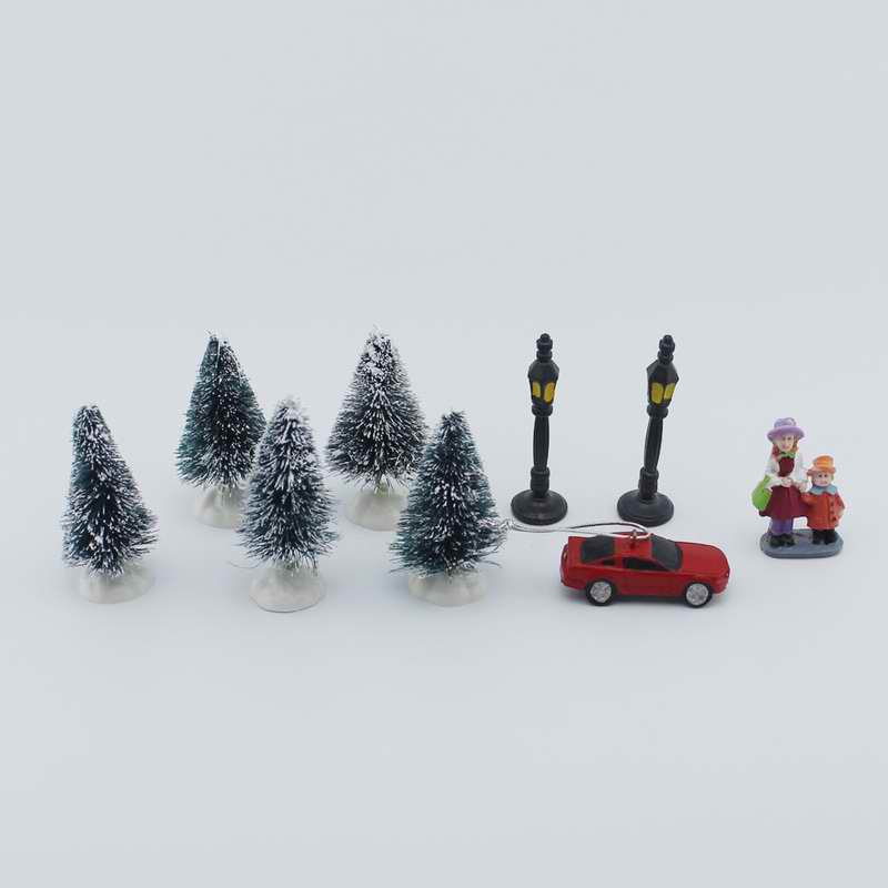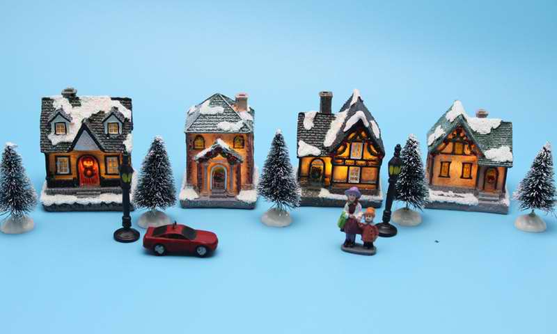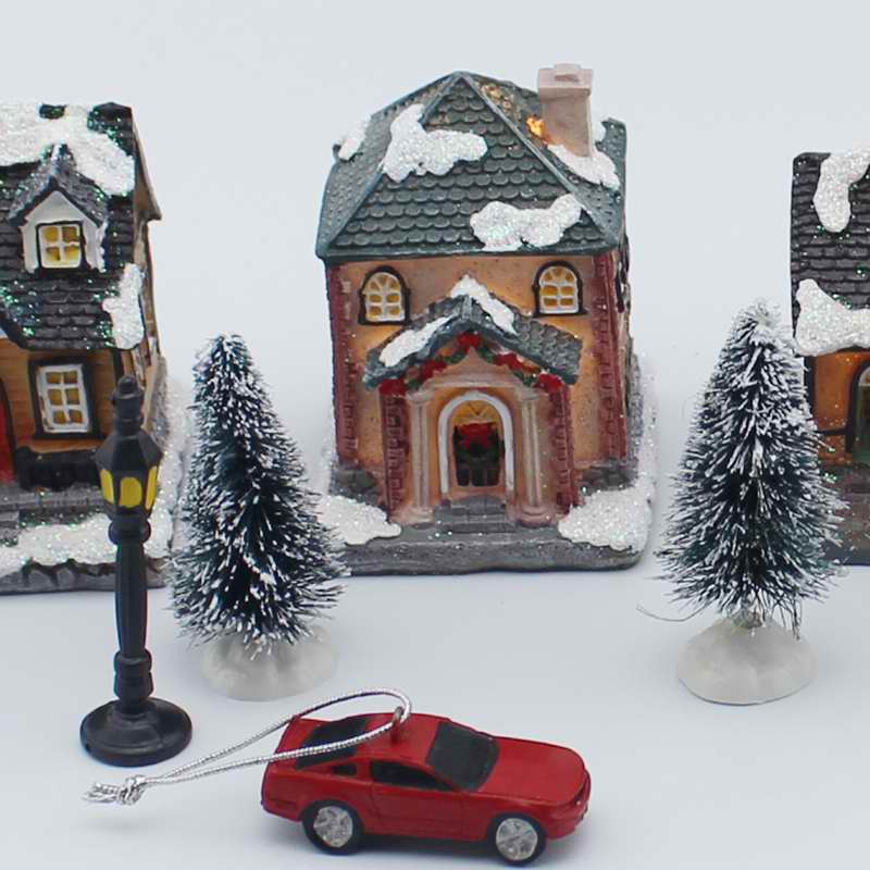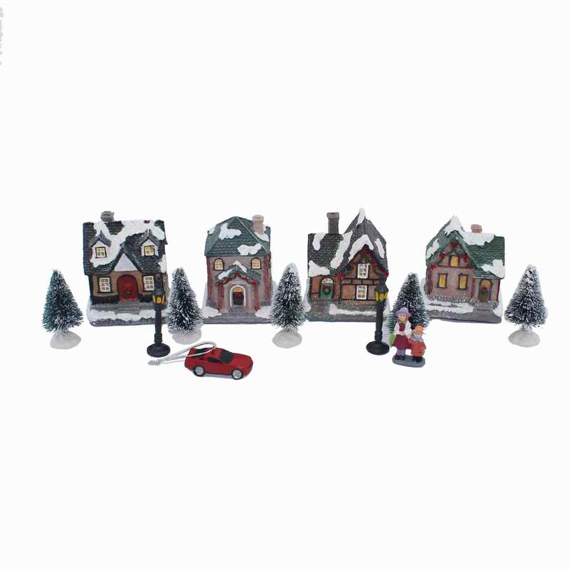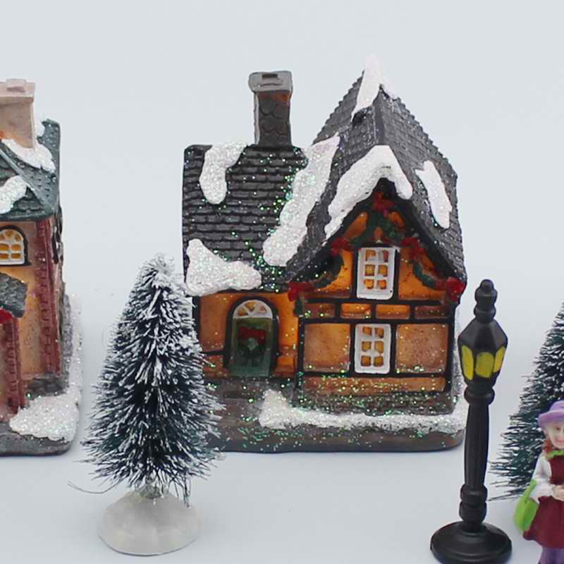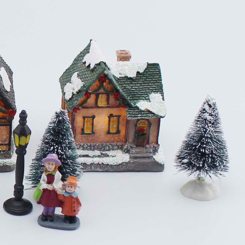 Xmas Decor Lighting up DIY Christmas Doll Figurine Artificial Tree Tiny Resin House Village (House village building Set of 4)